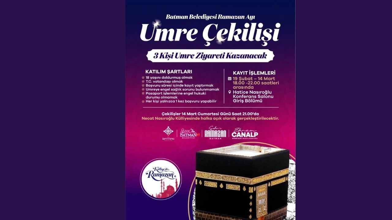 Batman Belediyesi, Ramazan ayının manevi atmosferine özel bir organizasyon düzenliyor. Ramazan etkinlikleri kapsamında gerçekleştirilecek Umre Çekilişi ile 3 hemşehri kutsal topraklara gitme hakkı kazanacak.