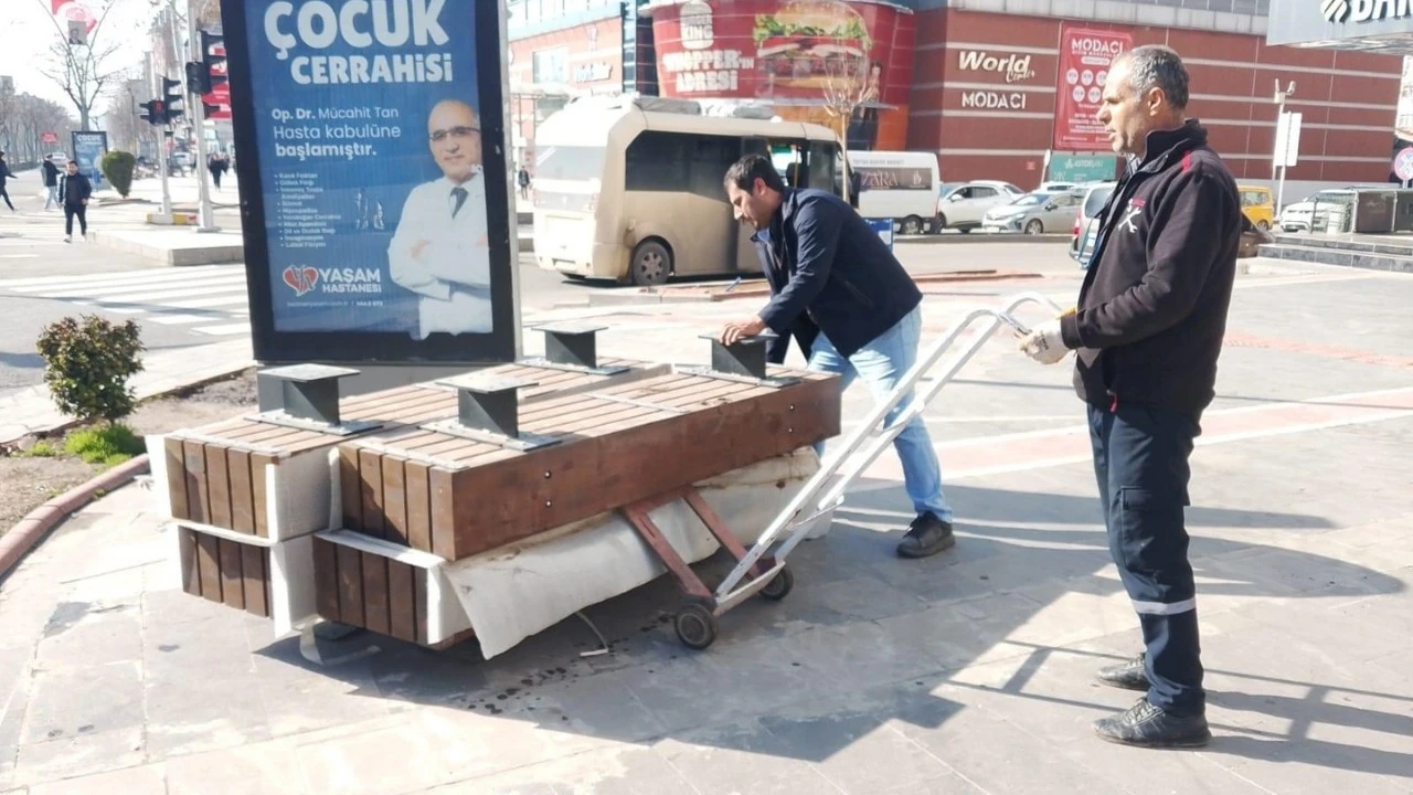 Çalışmalar kapsamında zamanla deforme olan oturma bankları sökülerek yerlerine yeni banklar yerleştiriliyor.