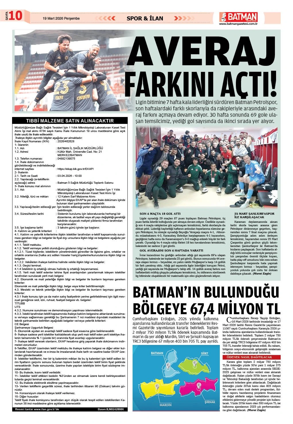 BATMAN’IN BULUNDUĞU BÖLGEYE 67,4 MİLYON TL
