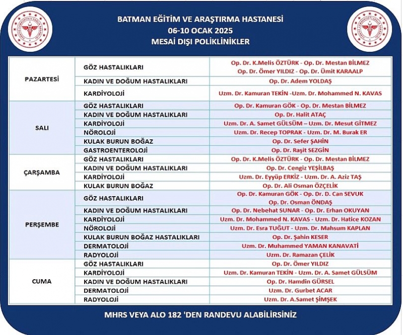 <div>Batman Eğitim ve Araştırma Hastanesi, sağlık hizmetlerine erişimi kolaylaştırmak amacıyla mesai dışı poliklinik hizmeti başlattı. Yeni uygulama kapsamında birçok branşta, mesai saatleri sonrası 17.00 ile 20.00 saatleri arasında hasta muayenesi yapılacak.</div> <div>Yetkilileri, bu hizmetin özellikle yoğun iş temposu nedeniyle gündüz saatlerinde hastaneye gitme imkânı bulamayan vatandaşlar için önemli bir çözüm olacağını belirtti. Sağlık hizmetlerine daha geniş bir erişim sağlamak ve hasta memnuniyetini artırmak amacıyla başlatılan bu uygulama, Batman halkı tarafından memnuniyetle karşılandı.</div> <div>Mesai dışı poliklinik hizmeti kapsamında dahiliye, genel Cerrahi, göz, kadın hastalıkları ve doğum, çocuk sağlığı ve hastalıkları, KBB, kardiyoloji, noroloji, gastroentereloji, dermatoloji, radyoloji, gibi birçok branşta uzman hekimler görev alacak. Yetkililer, uygulamanın randevu sistemiyle yürütüleceğini ve vatandaşların mağduriyet yaşamaması için düzenlemelerin titizlikle yapıldığını ifade etti.</div>