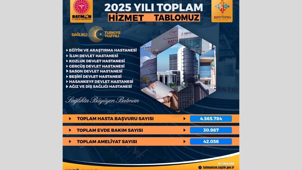 <div>Açıklamaya göre, kamu hastanelerinde 4,5 milyonun üzerinde muayene ve 42 binin üzerinde ameliyat gerçekleştirildi.</div> <div>Batman İl Sağlık Müdürlüğü, 2025 yılına ilişkin sağlık hizmetleri verilerini açıkladı.</div> <div>Açıklamada, merkez ve ilçelerdeki sağlık tesislerinde vatandaşlara sunulan hizmetlerin sayısal bilgilerine yer verildi.</div> <div></div> <h4>Batman'daki kamu hastanelerinde 2025 yılında toplam 4 milyon 565 bin 784 muayene gerçekleştirildi. Ayrıca A, B, C, D ve E grubu olmak üzere 42 bin 56 ameliyatın yapıldığı bildirildi.</h4> <div>Hastaneye gelemeyecek durumda olan vatandaşlar için yürütülen Evde Sağlık Hizmetleri kapsamında 30 bin 987 ev ziyareti gerçekleştirildi. Bu ziyaretlerde muayene, takip ve tedavi hizmetleri verildiği kaydedildi.</div> <div>Batman İl Sağlık Müdürlüğü yetkilileri, açıklamada sağlık hizmetlerinin erişilebilirliği, sürdürülebilirliği ve hizmet sayılarına ilişkin verileri paylaşmaya devam edeceklerini ifade etti.</div>