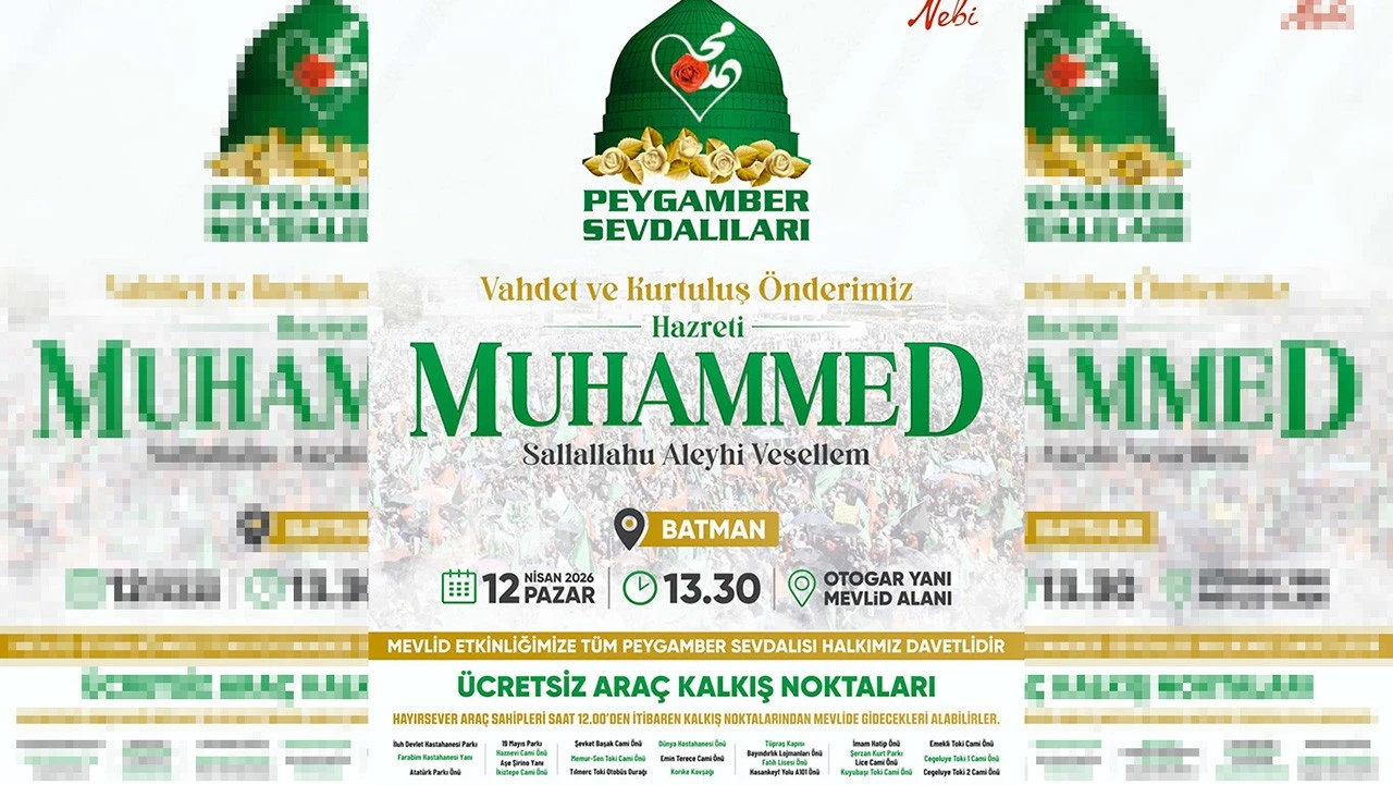 <div>Konuya ilişkin yazılı açıklama yapan Peygamber Sevdalıları Vakfı, "(Ey Muhammed!) Biz seni ancak âlemlere rahmet olarak gönderdik." ayetine atıfta bulunarak tüm halkı etkinliğe davet etti.</div> <div>Açıklamada genç, yaşlı, kadın ve erkek tüm vatandaşların katılımına açık olan programda Batman semalarının tekbir ve salavatlara şahitlik edeceği ifade edildi.</div> <div>Etkinliğin, 12 Nisan Pazar günü saat 13.30'da, Mevlid Alanı'nda (otogar yanı) gerçekleştirileceği bildirildi.</div> <div>Saat 12.00'den itibaren belirlenen noktalardan ücretsiz araç kaldırılacağı, hayırseverlerin de bu saatten itibaren vatandaşlara ulaşım desteği sağlayabileceği belirtildi.</div>