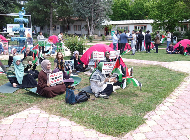 <div>Batman Üniversitesi öğrenci ve akademisyenleri, düzenledikleri kitlesel basın açıklamasıyla siyonist işgal rejiminin Gazze'de yaptığı soykırıma karşı ‘Kampüs İntifadası’ başlattı.</div> <div>Batman Üniversitesi Merkez Kampüsünde düzenlenen basın açıklamasına STK temsilcileri, üniversite öğrencileri ve akademisyenler katıldı.</div> <div>ABD ve Avrupa'daki üniversitelerde öğrenci ve akademisyenler, siyonist işgal rejiminin Gazze saldırılarına tepki gösterirken Türkiye'deki üniversitelerde de Gazze katliamına tepkiler gelmeye devam ediyor.</div> <div>Bu kapsamda Batman Üniversitesi'nde başlatılan ‘Kampüs İntifadası Çadır Nöbeti’ne katılan akademisyen ve öğrenciler basın açıklaması yaptı.</div> <div>Basın açıklamasını Öğrenci Toplulukları adına okuyan Taha Demir, 3 gün boyunca merkez kampüs bahçesinde Gazze'de yaşanan soykırıma ve katliamlara dikkat çekmek için çadırlarda nöbete devam edeceklerini belirtti.</div> <div></div> <div>"GAZZE'DE İNSANLIK KATLEDİLİYOR"</div> <div>7 Ekim'den bugüne terör şebekesi tarafından yapılan sistemli soykırımın, insanlık tarihinin en kanlı vahşetleri ile devam etmekte olduğunu belirten Demir, "15 binden fazla çocuğun, 10 binden fazla kadının öldürüldüğü, hastanelerin hedef alındığı, yeni doğmuş bebeklerin vahşice katledildiği insanlık tarihinin en kanlı soykırımına karşı yeryüzündeki her bir bireyin insanlık onurunun sesi olarak tepki vermesi insan olmanın temel gereksinimlerinden biridir." dedi.</div> <div>"İNSAN HAKLARI NEREDE”</div> <div>Tüm dünyanın gözü önünde çocuk, kadın demeden on binlerce masumun öldürülmesi ve iki milyona yakın insanın açlık ve kıtlıkla karşı karşıya bırakılmasından dolayı tepkiler gösterilmekte olduğunu belirten Demir, "Siyonizmin fonladığı siyasetçiler, devlet adamları bu tepkilere karşı şiddet uygulamaya başladılar. İnsani ve hukuki bir çerçevede gerçekleşen tepkileri şiddet yoluyla bastırmaya çalışan başta ABD ve Almanya olmak üzere Batı ülkelerini kınıyoruz. israil tarafından yapılan katliam ve soykırımların en büyük destekçisi olan ABD, Almanya ve diğer Batı yönetimlerinin bir yandan tüm dünyaya insan hakları, ifade özgürlüğü ve demokrasi dersi verirken, diğer yandan kendi içerisinde insanlık tarihinin en büyük vahşetlerinden birisine karşı insani tepkilerini gösteren öğrenci ve akademisyenlere yönelik sergilediği sert ve tahammülsüz tavrı kabul edilemez bulduğumuzu kamuoyuna ilan ediyoruz." ifadeleri kullanıldı.</div> <div>"İNSANLIĞIN SESİ OLARAK TEPKİLERİNİ ORTAYA KOYAN ÖĞRENCİ VE AKADEMİSYENLERİ SELAMLIYORUZ"</div> <div>Tüm dünyada insanların siyonistlerin Gazze'de yaptığı soykırımına kaşı büyük tepkiler ortaya koyduğunu belirten Demir, konuşmasına şöyle devam etti: "Son olarak ABD’de bulunan seçkin üniversitelerde öğrenci ve akademisyenler Gazze’de 200 günü aşkın süredir devam eden israil soykırımına karşı onurlu bir direniş başlatmıştır. ABD'de bulunan üniversitelerde başlayan ve 'Kampüs İntifadası' olarak ifade edilen eylemler, dünyanın farklı ülkelerinde bulunan seçkin üniversitelere yayılarak küresel bir tepki haline dönüşmüştür. Bizler de buradan bu onurlu tepkiye desteğimizi ilan ediyoruz. israil tarafından Gazze’de yapılan sistemli soykırıma karşı durmak adına insanlığın sesi olarak tepkilerini ortaya koyan öğrenci ve akademisyenleri selamlıyor ve Batman Üniversitesi öğrencileri ve akademisyenleri olarak kendileri ile dayanışma içerisinde olduğumuzu ilan ediyoruz." </div>