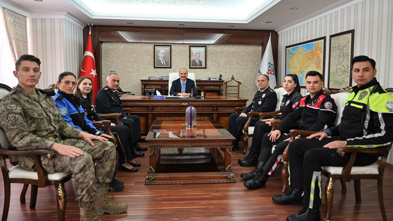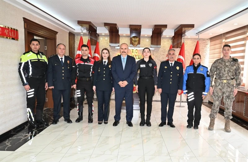 <div>Türk Polis Teşkilatı’nın 181. kuruluş yıl dönümü ve Polis Günü dolayısıyla Batman İl Emniyet Müdürü İbrahim Kaba ve beraberindeki emniyet personeli, Vali Ekrem Canalp’i makamında ziyaret etti.</div> <div>Ziyarette, İl Emniyet Müdürü İbrahim Kaba, kabulünden ve emniyet teşkilatına verilen desteklerden dolayı Vali Canalp’e teşekkür ederek, kentte yürütülen asayiş ve güvenlik hizmetleri hakkında bilgi verdi.</div> <div>Ziyaretten duyduğu memnuniyeti dile getiren VCanalp ise köklü geçmişiyle 181. yılını kutlayan Türk Polis Teşkilatı’nın Polis Günü’nü tebrik etti. Canalp, toplumun huzur ve güvenliği için görev yapan tüm emniyet mensuplarına başarı dileklerinde bulundu.</div> <div></div>