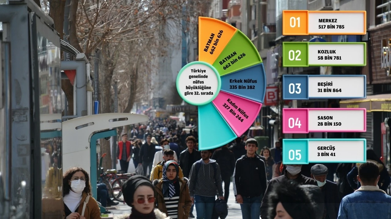 <div>Kent, Türkiye genelinde nüfus büyüklüğüne göre 32. sıradaki yerini korudu.</div> <div>Batman’da erkek nüfus 335 bin 382, kadın nüfus ise 327 bin 244 olarak kayıtlara geçti.</div> <h3><strong>MERKEZ BÜYÜYOR, KIRSAL KÜÇÜLÜYOR</strong></h3> <div>Nüfus artışının büyük bölümünün il ve ilçe merkezlerinde gerçekleştiği görüldü. Merkezlerde yaşayan nüfus 557 bin 414’e yükselirken, belde ve köylerde yaşayan nüfus 105 bin 212’ye geriledi. Veriler, kentte kırsaldan merkeze göç eğiliminin sürdüğünü ortaya koydu.</div> <h3><strong>ORTANCA YAŞ YÜKSELDİ</strong></h3> <div>Batman’da ortanca yaş 2024’te 25,4 iken 2025’te 25,9’a çıktı. Ortalama hanehalkı büyüklüğü 4,43 kişi olarak hesaplanırken, nüfus artış hızı binde 12,29 ve nüfus yoğunluğu kilometrekare başına 148 kişi oldu.</div> <h3><strong>GENÇ NÜFUS AZALIYOR</strong></h3> <div>15–24 yaş grubunda sınırlı bir düşüş görülürken 26–75 yaş ve üzeri gruplarda artış yaşandı. Bu tablo, kentte nüfusun kademeli olarak yaşlanma eğilimine girdiğini gösterdi.</div> <h3>EĞİTİM DÜZEYİ YÜKSELİYOR</h3> <div><span>TÜİK verilerine göre Batman’da okuryazarlık oranı 2024 yılı itibarıyla yüzde 96,02’ye ulaştı. Ayrıntılı eğitim istatistiklerinin Mayıs 2026’da açıklanacağı bildirildi.</span></div> <h3><strong>DOĞUM ORANI TÜRKİYE ORTALAMASININ ÜZERİNDE</strong></h3> <div>Kentte kaba doğum hızı 2024 yılında binde 17,6 olarak gerçekleşti. Türkiye ortalamasının üzerindeki bu oran, Batman’ın genç nüfus potansiyelini koruduğunu ortaya koydu. 2025 yılına ait doğum verilerinin de Mayıs 2026’da paylaşılması bekleniyor.</div> <h3><strong>EN KALABALIK İLÇE MERKEZ</strong></h3> <div>ADNKS verilerine göre en kalabalık ilçe 517 bin 785 kişiyle Merkez ilçe oldu. Merkez ilçeyi Kozluk (58 bin 781), Beşiri (31 bin 864) ve Sason (28 bin 150) izledi. Nüfus artışının yalnızca Merkez ilçede pozitif olduğu, diğer ilçelerde ise düşüş yaşandığı görüldü.</div> <div>İlçeler arasında ortalama hanehalkı büyüklüğü en yüksek ilçe 4,85 kişiyle Kozluk olurken, en düşük ortalama 3,41 kişiyle Gercüş’te kaydedildi. TÜİK, doğum ve eğitim verilerinin açıklanmasının ardından kentin demografik yapısına ilişkin daha kapsamlı değerlendirmelerin yapılabileceğini bildirdi.</div>
