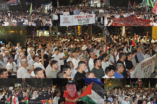 <div>Batman'da bir araya gelen on binlerce kişi, HAMAS Siyasi Büro Başkanı İsmail Haniye'nin siyonist işgal rejimi tarafından düzenlenen suikast sonucu katledilmesini düzenlenen yürüyüşle protesto etti.</div> <div></div> <div>Batman'da İslami sivil toplum kuruluşu öncülüğünde bir araya gelen on binlerce kişi, İran'ın başkenti Tahran'da dün siyonist işgal rejimi tarafından düzenlenen suikast sonucu şehit edilen HAMAS Siyasi Büro Başkanı İsmail Haniye için protesto yürüyüşü gerçekleştirdi.</div> <div></div> <div>İsmail Heniyye suikastını ve masum Gazze halkına karşı yapılan katliamı protesto eden öfkeli bir grup, yürüyüş öncesi siyonist işgal rejimine desteğini açıklayan Starbucks şubesine saldırdı. Olayda 3 kişinin ise gözaltına alındığı öğrenildi.</div> <div></div> <div>Ardından Batman Park önünde kortej eşliğinde başlayan yürüyüş, Atatürk Parkı önüne kadar sürdü.</div> <div>Filistin ile Tevhid bayrakları taşıyan ve yürüyüş esnafında sık sık tekbir getiren vatandaşlar yürüyüş boyunca; "Kahrolsun israil, kahrolsun Amerika", "HAMAS'a selam direnişe devam", "Zalimler için yaşasın cehennem" sloganları attı.</div> <div>Protesto gösterisi burada yapılan basın açıklamasıyla devam etti.</div> <div>Basın açıklamasında Kur'an'ı Kerim okundu, Filistinli mazlumlar için dualar edildi.</div> <div></div> <div>Sivil toplum kuruluşları adına kısa bir konuşma yapan İTTİHADUL ULEMA üyesi Molla Osman Teyfur, İsmail Heniyye'nin şehit edilmesi nedeniyle bugün çok mahzun ve hüzünlü olduklarını söyledi.</div> <div></div> <div><strong>"DARBELER BİZİ YENİLGİYE UĞRATMAMIŞTIR"</strong></div> <div>"Çünkü azgın düşman kalbimizi yaraladı" diyen Teyfur, "Ama biz bu darbelere ve dertlere yabancı değiliz. Geçmiş tarihlerde de böyle büyük darbeler bize vurulmuştu. Ama hiçbir darbe bizi yenilgiye uğratmamıştır. Bu darbe ve yaralar bizlerin öfkesini daha da büyütüp, bizleri birbirimize sımsıkı tutunmaya ve zafer yolunu açmıştır. Şehit İsmail Haniye'den önce de pek çok yiğit lider (Salih Aruri, Fethi Şikaki, Rantisi, Yahya Ayyaş ve Şeyh Ahmet Yasin) Filistin'de şehit olmuştur." ifadelerini kullandı.</div> <div></div> <div><strong>"KATLİAMLAR CİHAT RUHUNU BÜYÜTÜYOR"</strong></div> <div>İslam yolunda mücadele eden liderlerin şehadetlerinin İslami direnişi daha da büyüttüğüne dikkat çeken Teyfur, şöyle devam etti: "Filistin halkını daha çok hiddetlendirip cihat ruhunu büyütmüştür ve düşmana daha büyük darbelerin vurulmasına vesile olmuştur. Uhud Savaşı'nda Hazreti Hamza gibi büyük bir pehlivanı, Musab bin Ümeyr gibi 70 küsur sahabe şehid olmuştu. Peygamber efendimizin sahabeleri o zamanda çok mahzun ve üzülmüşlerdi. Kalpleri ağrıyordu ve bu büyük darbenin başlarına niye geldiğini söylüyorlardı? Allah Teâlâ Uhud Savaşı'nda yaşanan musibet için bugün bize hitap eder gibi 'Gevşeklik göstermeyin, üzülmeyin; eğer inanmışsanız şüphesiz en üstün olan sizsiniz.' diye buyurmaktadır."</div> <div></div> <div>Protesto gösterisi İTTİHADUL ULEMA üyesi Molla Ali Altun'un yaptığı dua ile son buldu. </div>