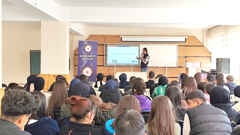 <div>Batman Siber Suçlarla Mücadele Şube Müdürlüğü, Gazi Mesleki Teknik ve Anadolu Lisesi'nde eğitim gören 350 öğrenciye, teknoloji bağımlılığı, siber suçlar ve güvenlik önlemleri konularında bilgilendirme yaptı. Öğrencilere bilgilendirici broşürler dağıtıldı.</div>