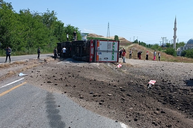 Edinilen bilgilere göre Batman istikametine gelmekte olan 33 HR 631 plakalı et yüklü tır, sürücüsünün direksiyon hâkimiyetini kaybetmesi sonucu devrilerek yan yattı.