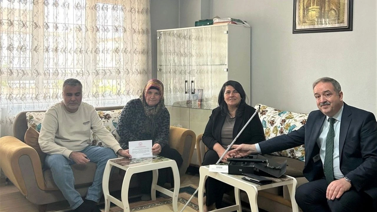 Batman Valisi Ekrem Canalp’in eşi Dr. Ayten Canalp, Aile ve Sosyal Hizmetler İl Müdürü Mehmet Zeki Eryarsoy ile birlikte gaziyi evinde ziyaret ederek, akıllı bastonu takdim etti.