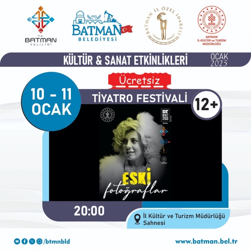 Batman, 06-30 Ocak tarihleri arasında düzenlenecek Tiyatro Festivali ile tiyatroseverleri ağırlamaya hazırlanıyor. Batman Valiliği, Batman Belediyesi ve İl Kültür ve Turizm Müdürlüğü’nün koordinesinde gerçekleşecek festival, Antalya, Kayseri, Sivas ve Van Devlet Tiyatroları'nın oyunlarının yanı sıra yerel tiyatro gruplarının da sahne alacağı etkinliklere ev sahipliği yapacak.