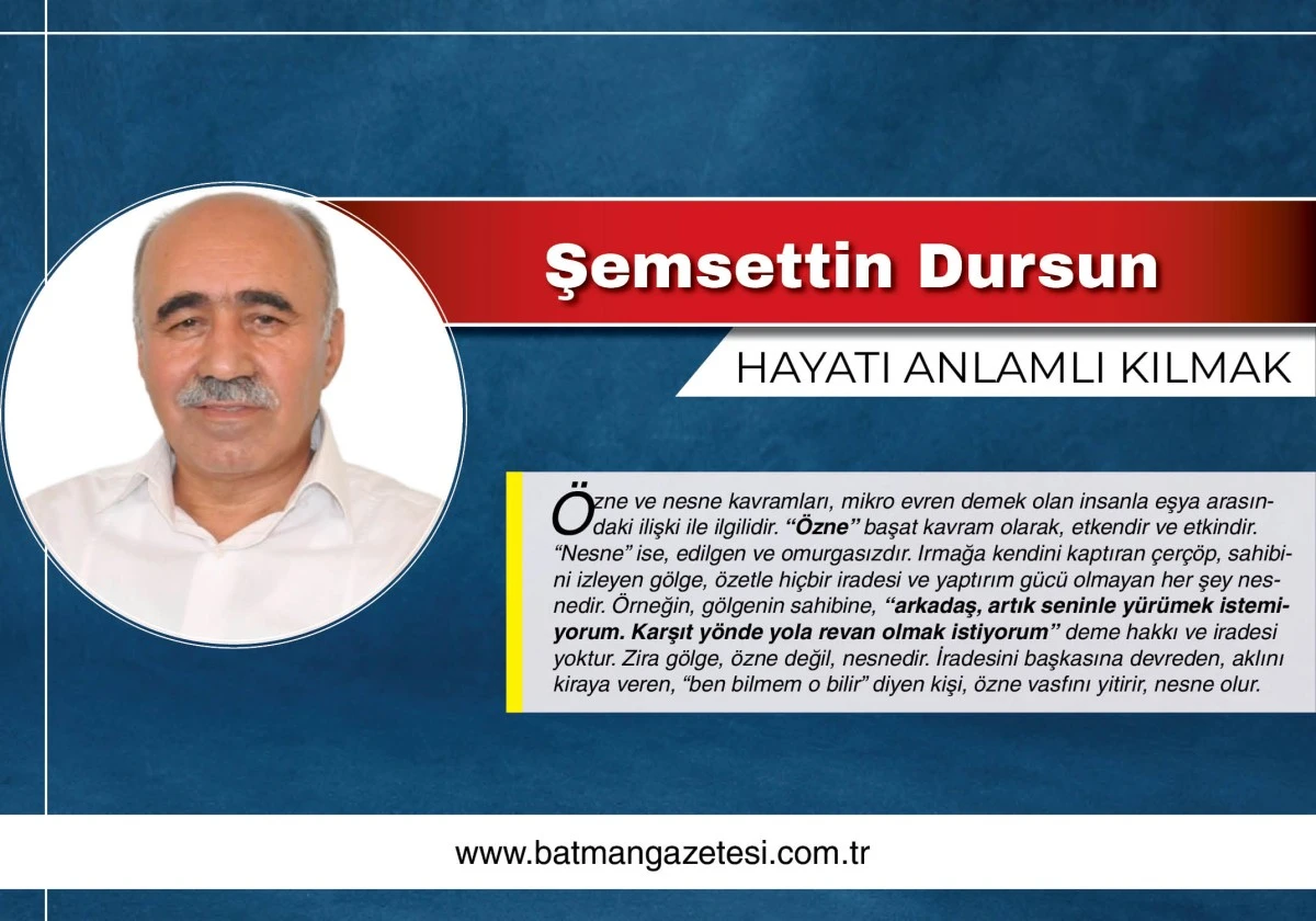 “Özne” olmak; özünün, varlığının farkında olmak, akledebilmek, tefekkür edebilmek, tasavvur edebilmekle mümkündür. “Özne” olmanın olmazsa olmaz şartı, özgür olmaktır. Buradaki özgürlük, fiziksel özgürlükten ziyade, zihinsel özgürlüktür. Burada zindanda da olsa zihinsel olarak özgür olan kişi, öznedir. Aksine sarayda da olsa, aklını ve iradesini kiraya veren kişi, özne değil nesnedir. Kişinin kendisini nesne olarak ifade etmesi veya nesne rolünü kuşanması , insana yapılabilecek en büyük kötülüktür. İnsan özne olarak, eşya da nesne olarak güzeldir. Bu güzelliği kuşanmak, fıtratın gereği ve herkesin yararınadır.